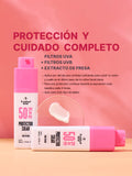 Este protector solar de textura ultrafluída se absorbe al instante, sin dejar rastro blanco. Con extracto de fresa y sábila, protege, hidrata y calma al mismo tiempo.